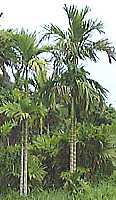 | BRIEF DESCRIPTION An evergreen tree (palm) reaching up to 10-30 m in height with a stem up to 15 cm in diameter and a crown of 10-20 leaves. The fruits are about 5 cm long, orange when ripe, with fibrous husk and a single seed. USES It provides seed that are chewed as a masticatury. The seeds are wrapped in a betel pepper leaf with lime and chewed. It has medicinal properties and can be grown as an ornamental. GROWING PERIOD Perennial. Flowering begins 4-6 years after planting, the tree comes into bearing after 7-8 years, and reaches full bearing at 10-15 years. The economical life of the tree is 40-60 years, but it may live up to 100 years. Fruit takes about 240 days to ripen from pollination. COMMON NAMES Betel palm, Betel nut, Areca palm, Areca nut, Noix d`arec, Arequier, Supari, Pinang, Supari, Gua, Adike, Kamuya, Poka-vakka, Kun, Thamul, Supari, Adikke, Adakkamaram, Kavungu, Pophal, Kamugu, Pakku maram, Vakka. FURTHER INF Scientific synonym: A. cathecu. Betel palm is believed to be native of South or Southeast Asia. It is adapted to humid maritime climates of the tropics and can be grown from sea level up to 1000 m. Mentioned as a useful agroforestry species. | Sources |